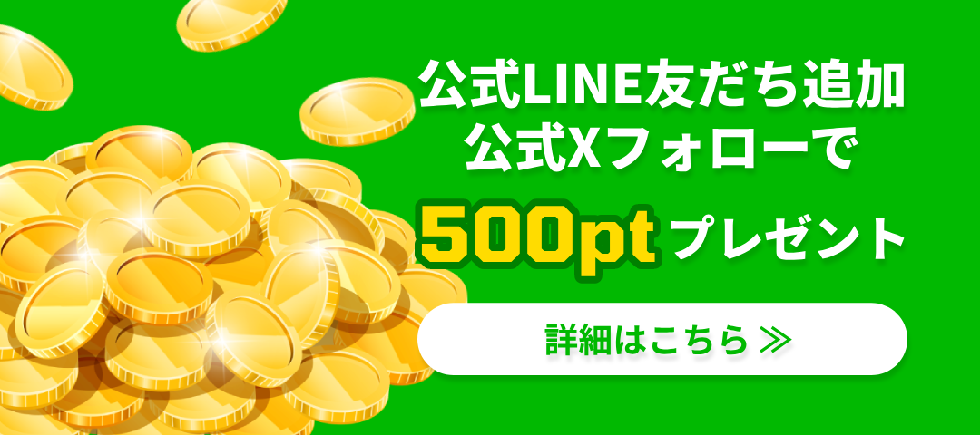 公式LINEのともだち登録、公式Xフォローで500ptプレゼント!